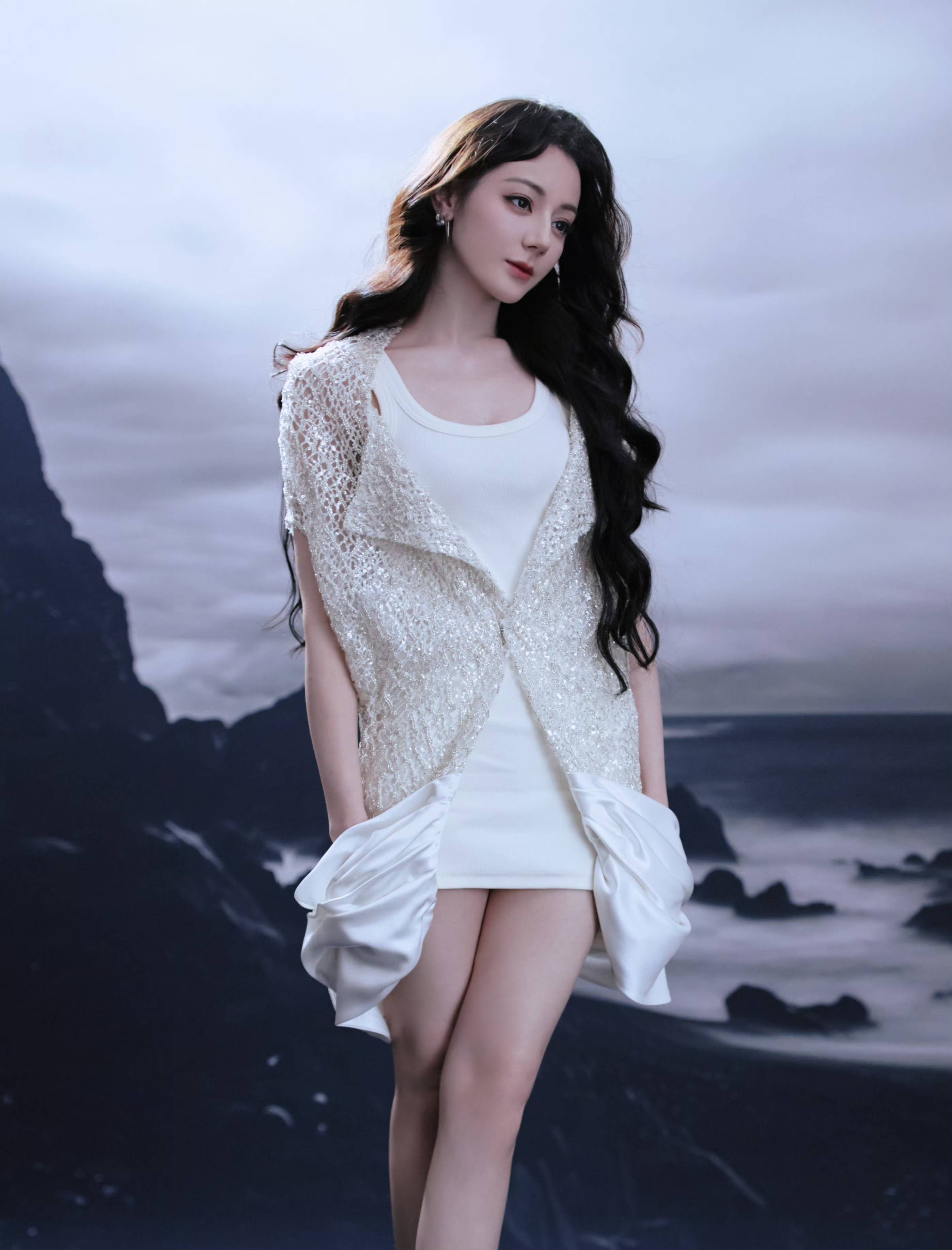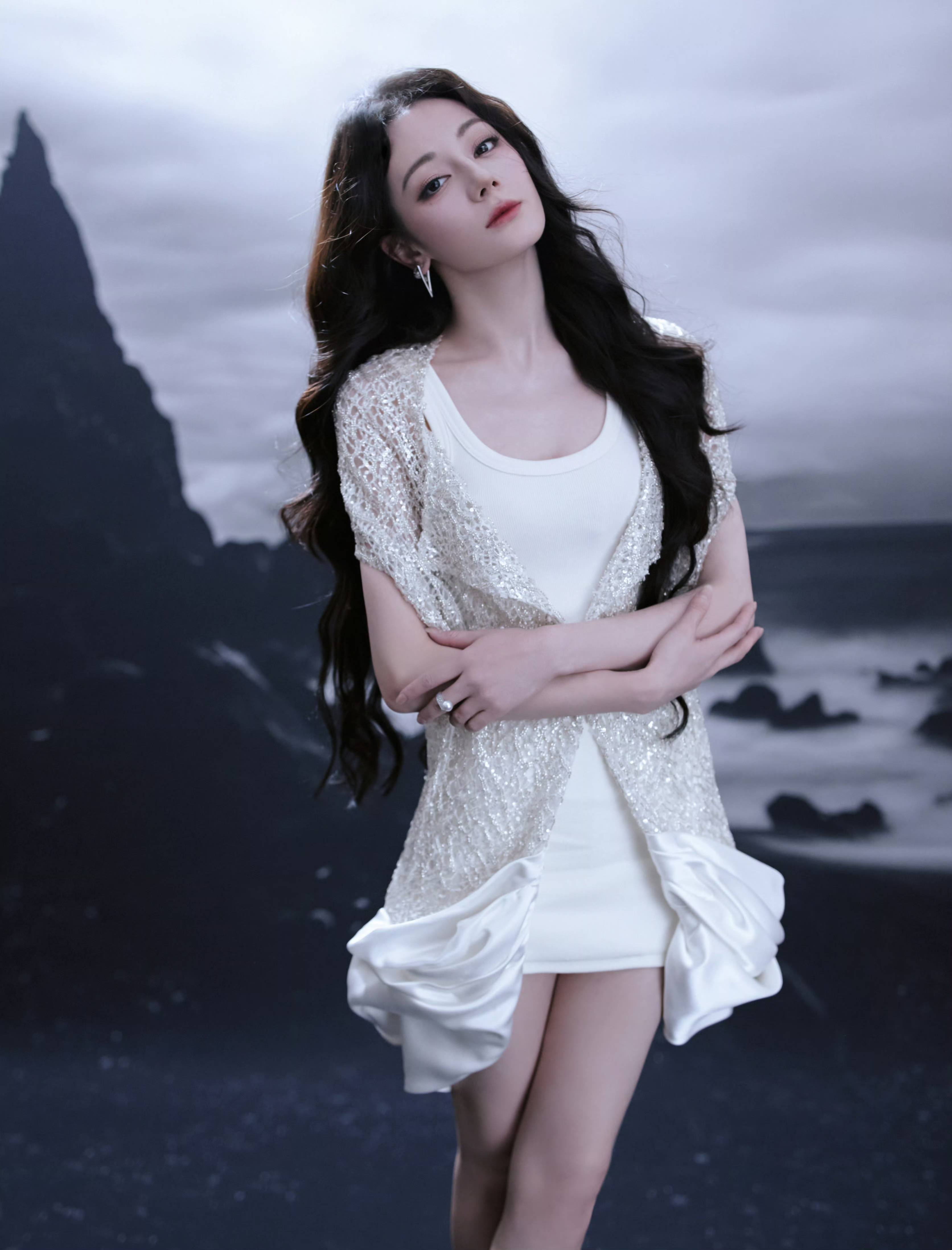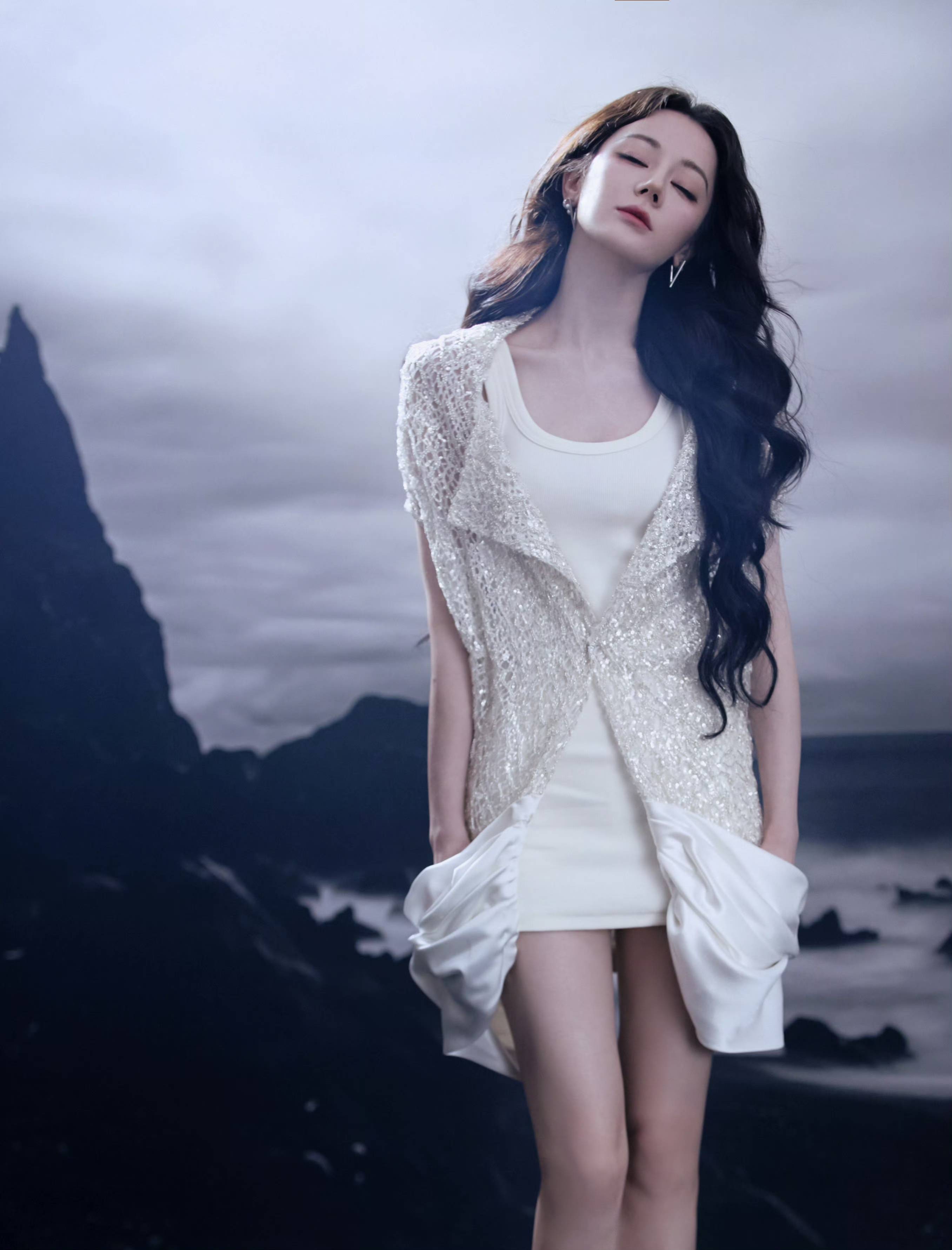 迪丽热巴这套Juana Martín Fall 2024 Couture高定造型真的杀疯了!白色镂空外套缀满细碎闪钻,搭配极简白裙,在冷调山海背景的衬托下,像从冰雪秘境走出的优雅精灵。